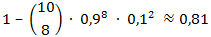 Eine Therapie ist mit der Wahrscheinlichkeit p=0,9 erfolgreich. Dann ist die Wahrscheinlichkeit, dass von 10 Behandlungen mindestens 8 erfolgreich verlaufen, gleich